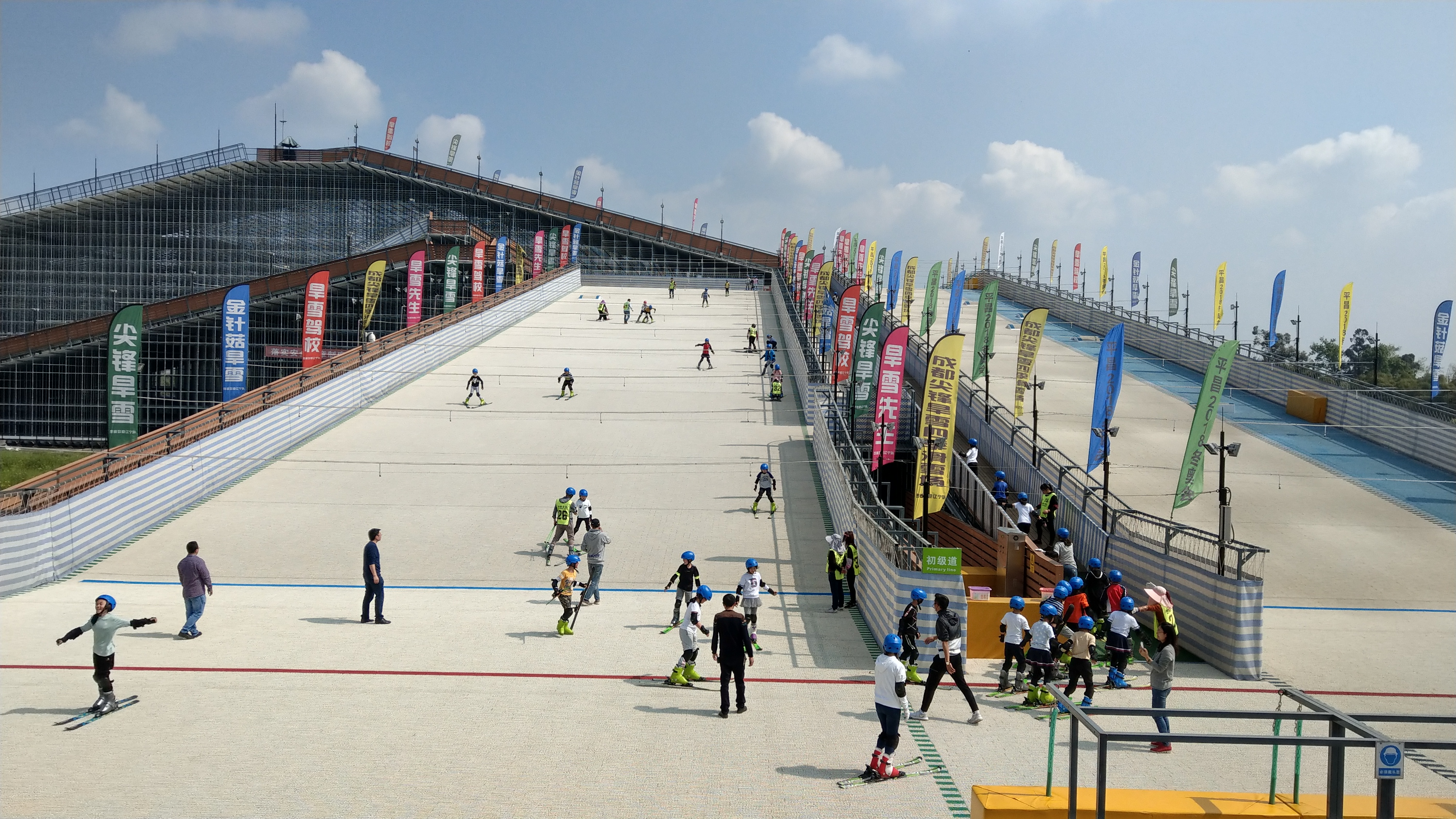 Xindu JF Dryski Four Seasons Ski Resort is located in Xindu Jianfeng Sports Park in Chengdu. The dry ski resort was built in early 2017. It is the largest dry ski resort in Southwest China, invested in and built by JF Dryski. The foundation of the ski resort is built with durable galvanized wheel-buckle scaffolding. The ski resort rises from the ground and is structured into a pyramid shape. The dry snow material in the ski resort adopts the world’s most advanced Enoki mushroom dry ski mats (fourth generation) and is equipped with the safest special protective equipment. The construction area of the ski resort is about 20,000 square meters, and the snow track area is about 13,000 square meters. The highest point is 27 meters above the ground, and the longest snow track is 178 meters.