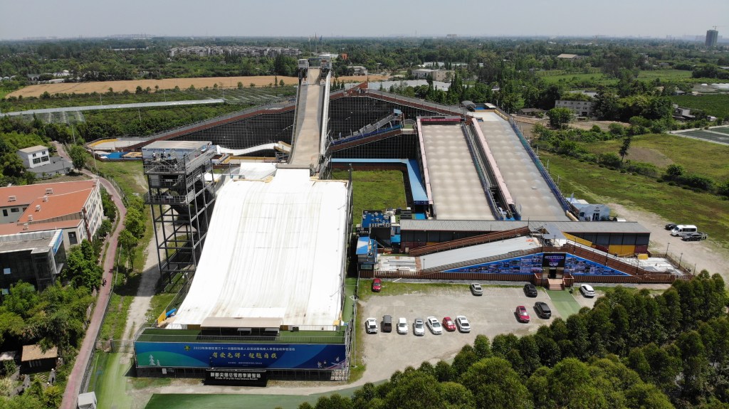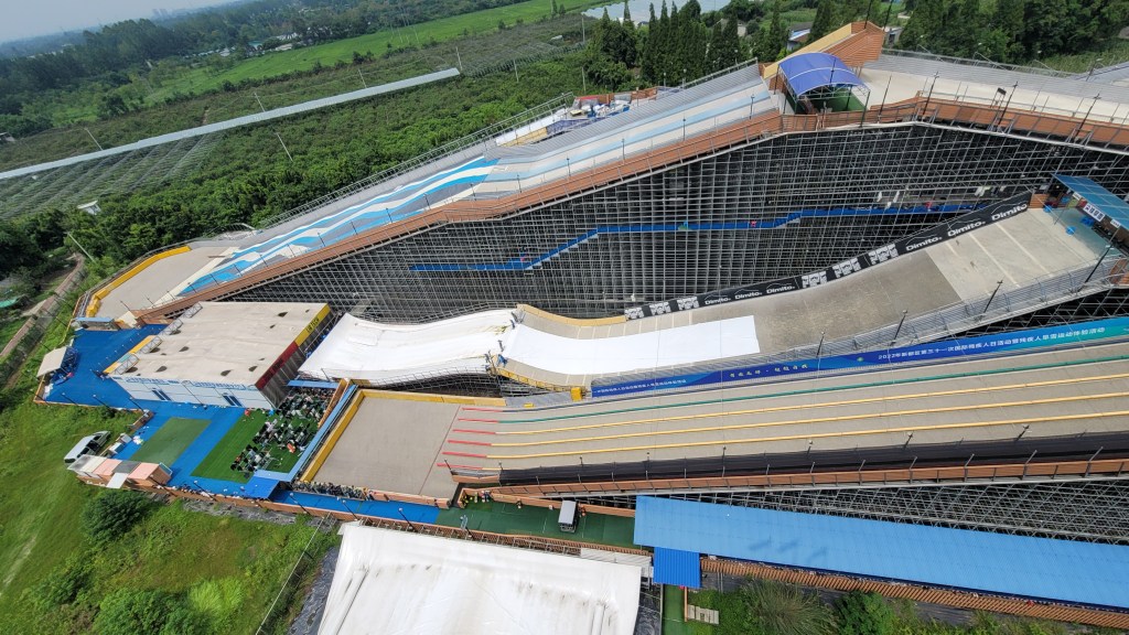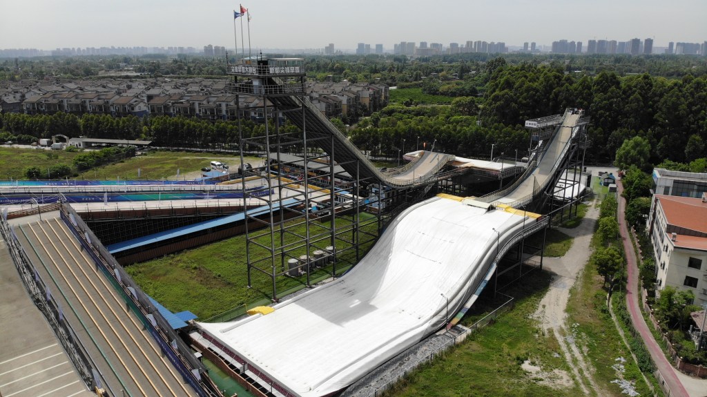 The ski slope uses JF dry ski mats, the air bag is “straw style”, and athletes reach the starting platform via a magic carpet.