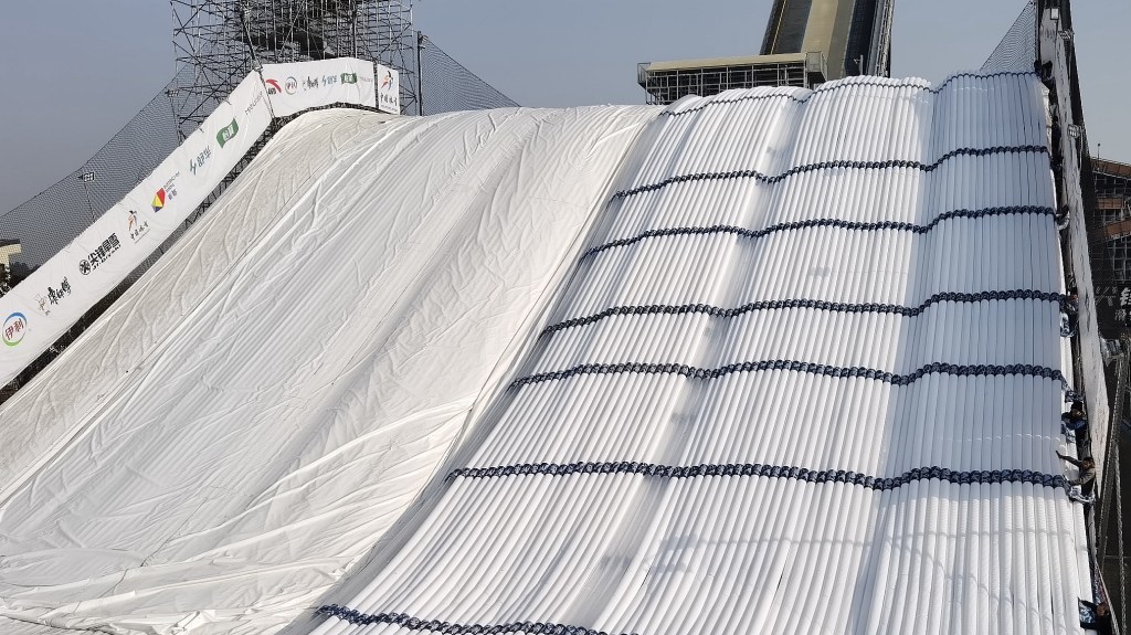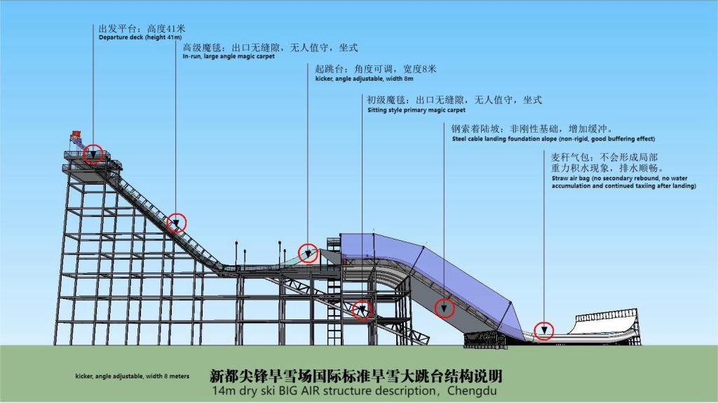 The ski slope uses JF dry ski mats, the airbag is “straw style,” and athletes reach the starting platform via a magic carpet.